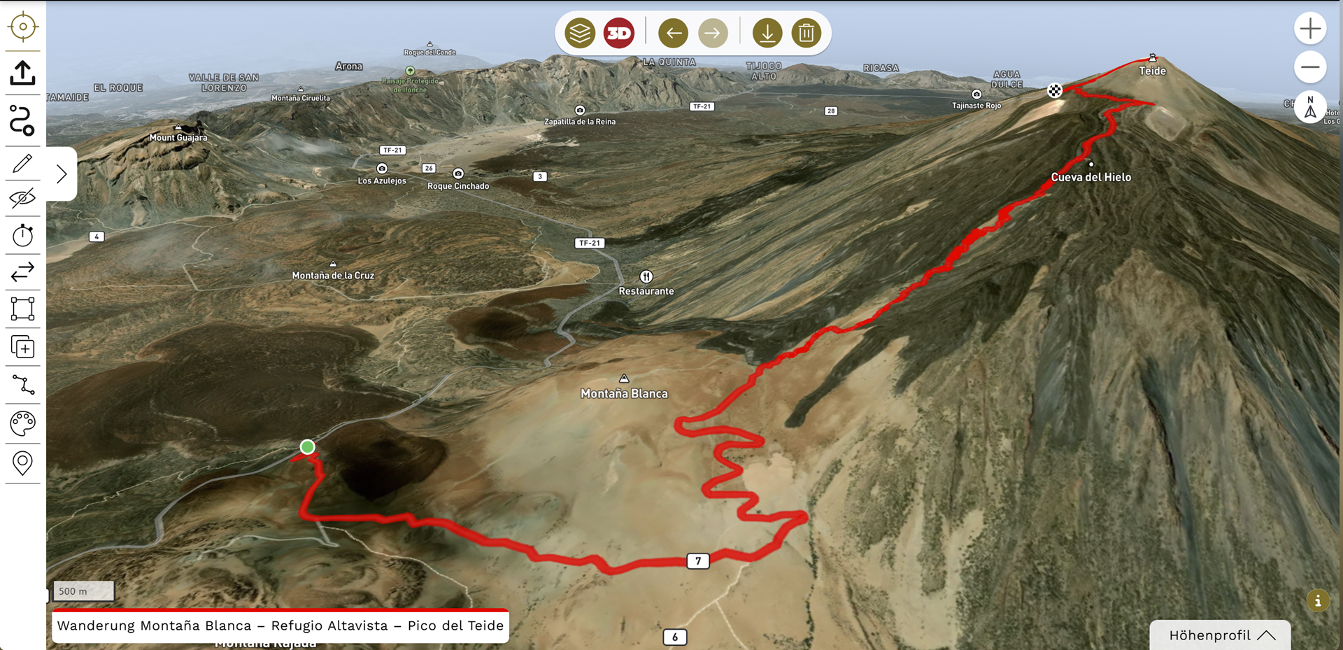 Auf der linken Seite der Benutzeroberfläche befindet sich die Wanderwerkzeug-Leiste, die alle Funktionen zum Bearbeiten einer Route enthält.