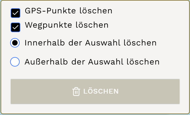 Je nach Auswahl im Dialogfeld werden durch Klicken auf die Schaltfläche »Löschen« GPS-Punkte innerhalb oder außerhalb der Auswahl entfernt.
