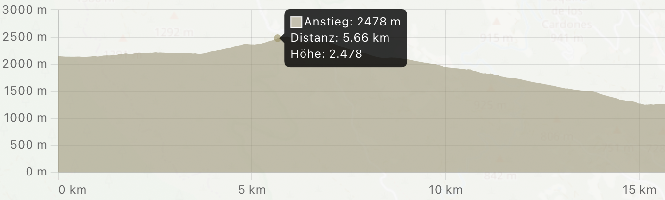 Wenn du mit dem Mauszeiger über das Höhenprofil fährst, werden die Statistiken (Anstieg, Distanz und Höhe) an der Cursorposition in einem Tooltip angezeigt.