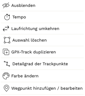 Ausblenden: Die Funktion »Ausblenden« blendet die Route vorübergehend aus der Karte aus. Ausgeblendete Tracks können an gleicher Stelle wieder eingeblendet werden. |