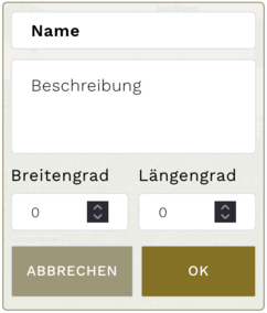 Um einen Wegpunkt zu erstellen, muss zunächst der Name des Wegpunkts im Dialogfeld ausgefüllt werden. Optional kann eine Kurzbeschreibung hinterlegt werden. Im Anschluss kann die Position des Wegpunktes entweder durch Klicken auf die Karte oder durch manuelle Eingabe der Koordinaten festgelegt werden. Durch Betätigen der Schaltfläche »OK« wird der ausgewählte Wegpunkt zur aktuellen Route hinzugefügt.