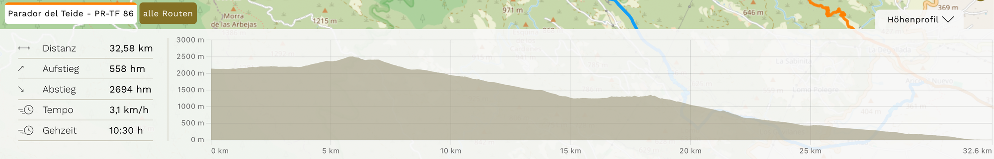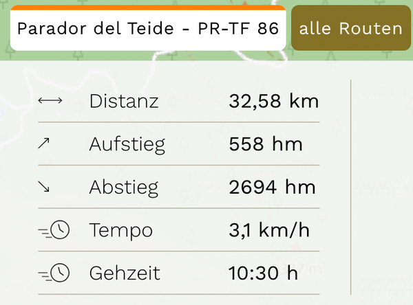 Zeigt die Statistiken der aktuell gewählten Route an: Kilometer-Distanz, Höhenmeter im Auf- und im Abstieg, sowie Tempo und errechnete Gehzeit.