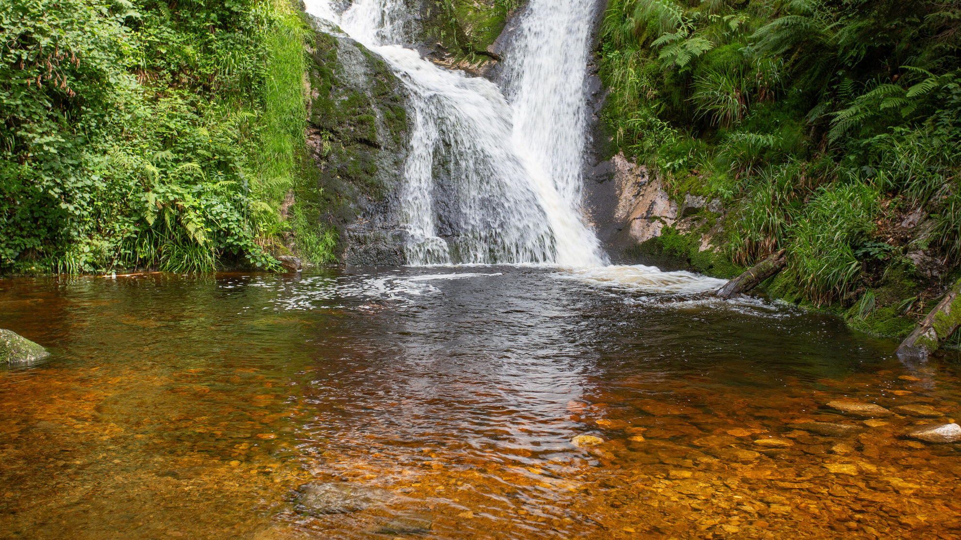 Aus rund 40 Metern stürzt das Wasser in zwei Stufen hinab, kraftvoll und unübersehbar. Man spürt die Gischt, hört das Tosen – hier zeigt der Schwarzwald seine wilde Seite.